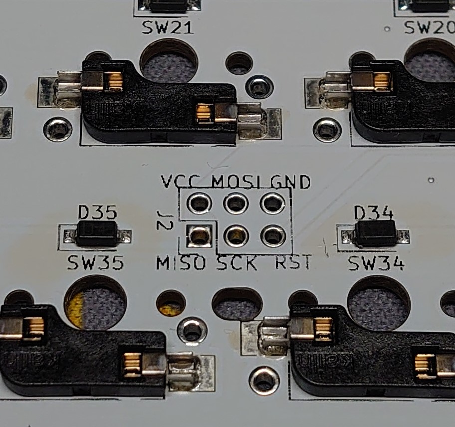 - 基板の6か所開いている穴のうち、隣に書いてあるテキストのGNDとRSTに対応する穴をピンセットで触って繋ぐ